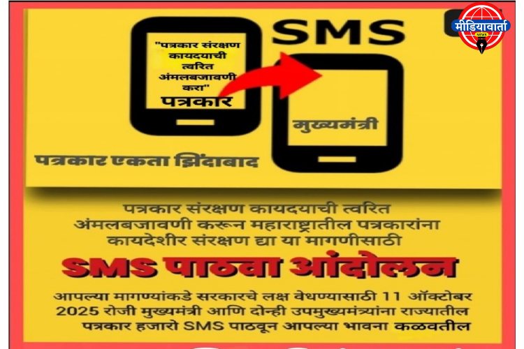 पत्रकार संरक्षण कायद्याची तात्काळ अंमलबजावणी करण्याच्या मागणीसाठी महाराष्ट्रातील पत्रकारांनी आंदोलनाचा बिगुल वाजवला आहे. या आंदोलनाचा पहिला टप्पा म्हणून ११ ऑक्टोबर रोजी “एसएमएस पाठवा आंदोलन” होणार आहे. या दिवशी राज्यभरातील पत्रकार मुख्यमंत्री आणि दोन्ही उपमुख्यमंत्र्यांना हजारो एसएमएस पाठवून सरकारचे लक्ष आपल्या मागण्यांकडे वेधणार आहेत. हे आंदोलन पत्रकार अभिव्यक्ती संरक्षण मंचाच्या वतीने राबवले जात आहे.