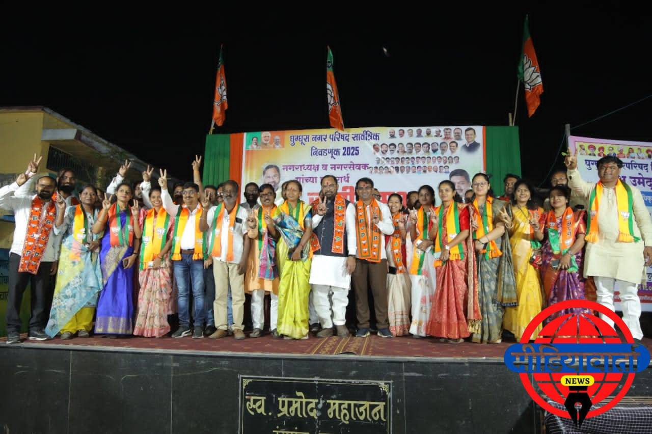 घुग्घुस :नगर परिषद सार्वत्रिक निवडणूक 2025 च्या पार्श्वभूमीवर भारतीय जनता पार्टी, घुग्घुसतर्फे नगराध्यक्ष व नगरसेवक पदाच्या उमेदवारांच्या प्रचारार्थ गुरुवारी आमदार किशोर जोरगेवार आणि आमदार देवराव भोंगळे यांच्या प्रमूख उपस्थितीत भव्य पदयात्रेचे आयोजन करण्यात आले. टिळक नगर येथून निघालेल्या पदयात्रेचे आठवडी बाजार चौक येथ सभेत रूपांतर झाले. यावेळी बोलतांना आमदार किशोर जोरगेवार यांनी विकासाच्या मुद्यावर आपण निवडणुकीला समोर जात असुन नगराध्यक्ष पदासह सर्व नगर सेवकांना निवडणुन देण्याचे आवाहन आमदार किशोर जोरगेवार यांनी केली.